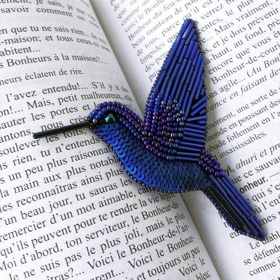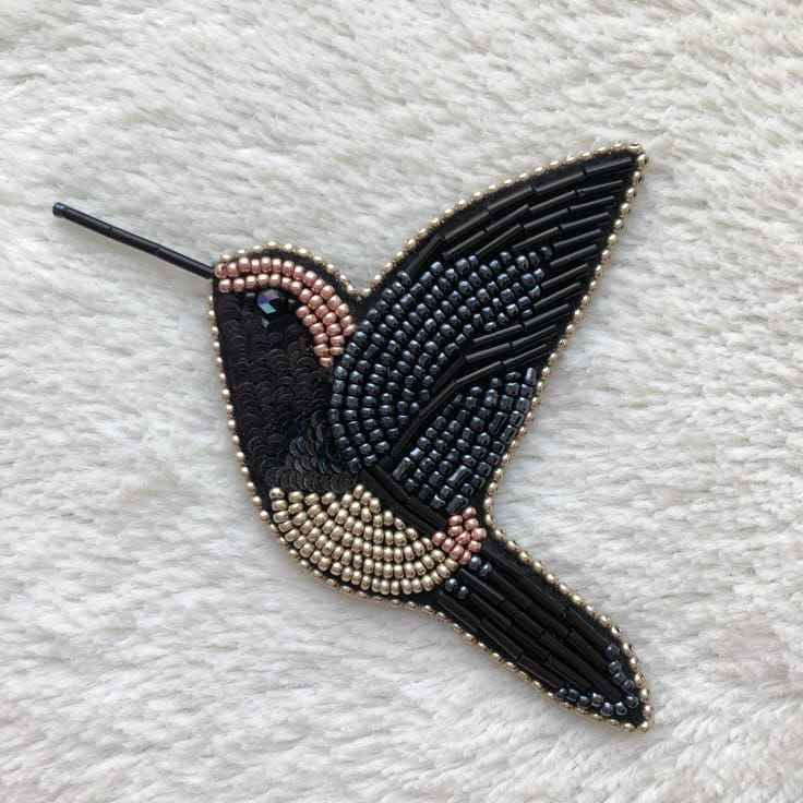 Broche Colibri Irisé Nuit Noire, Perles Violettes et Perles de Verre Azur Perlées à la Main, Épingle de Revers Oiseau de Luxe pour Femme