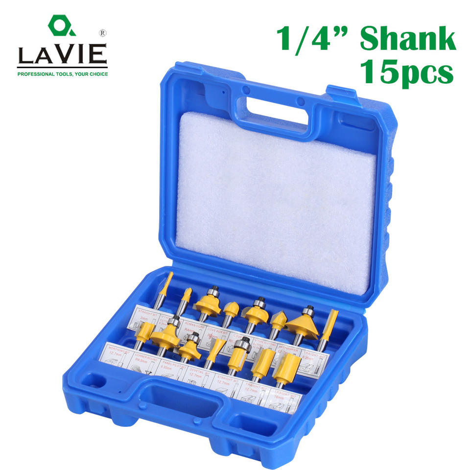 Ensemble de 15 fraises à tiges de 1/4 pouces avec pointes en carbure pour machine à graver le bois