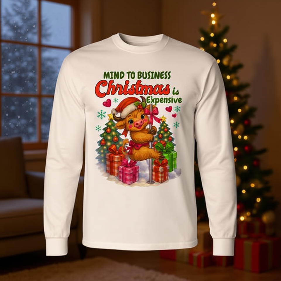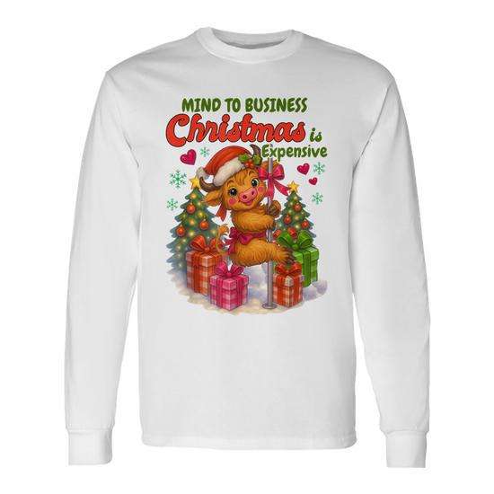 Mind To Business Christmas Is Expensive T-shirt à manches longues avec motif de vache des Highlands, col rond, unisexe, pour adulte, impression numérique