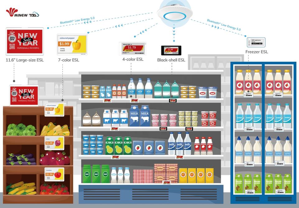 MinewTag nouveau Kit de démonstration ESL BLE 5.0 étiquette d'étagère électronique étiquette de prix intelligente colorée système de passerelle d'étiquettes Eink synchronisation API POS ERP MES