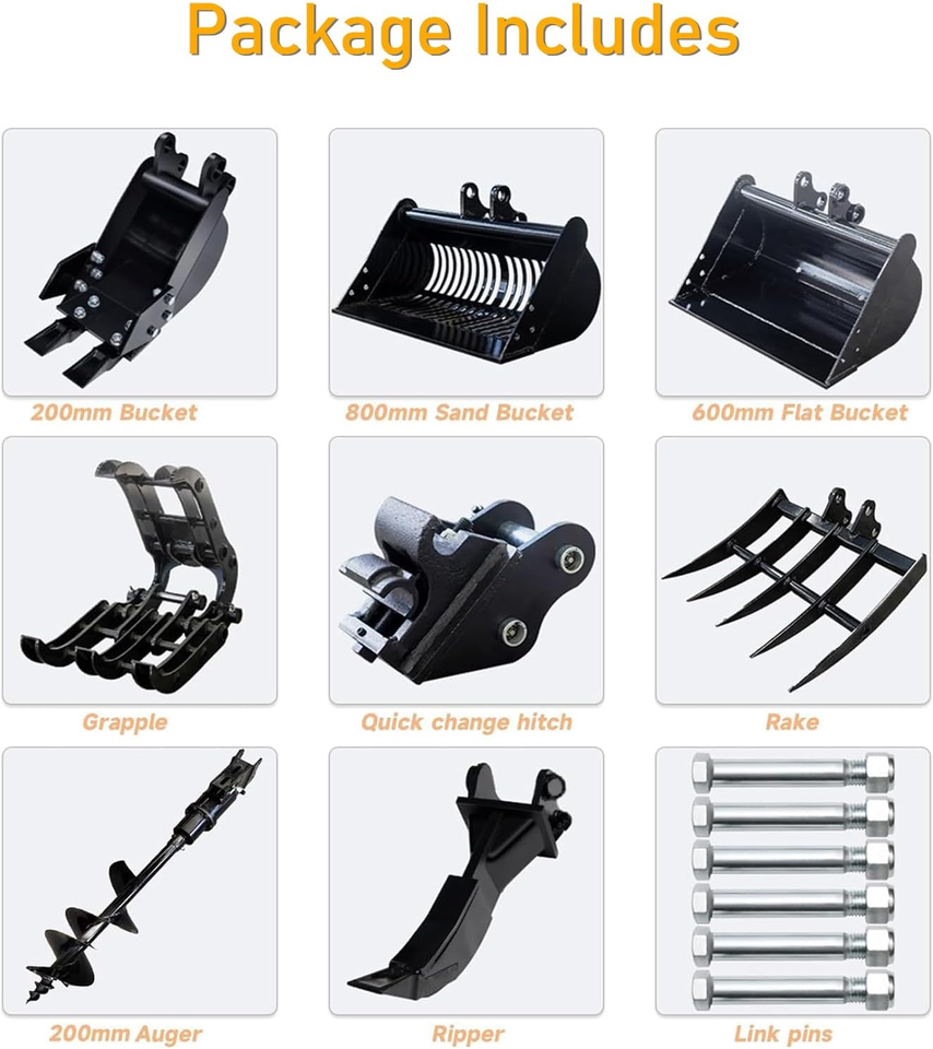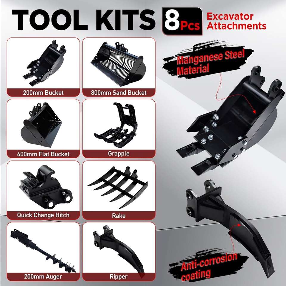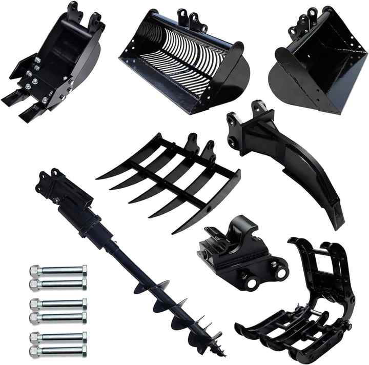 Accessoires de rechange pour mini-excavatrice avec godet étroit, ripper, râteau, tarière, grappin, attache rapide, godet de criblage et kit d'accessoires