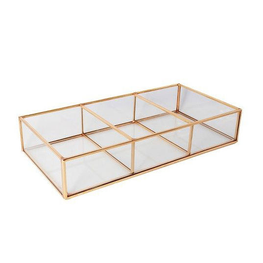 Mini boîte en verre, cadre en laiton transparent avec chaîne, finition dorée en 2 pièces pour la décoration de table à la maison et au bureau et boîtes polyvalentes