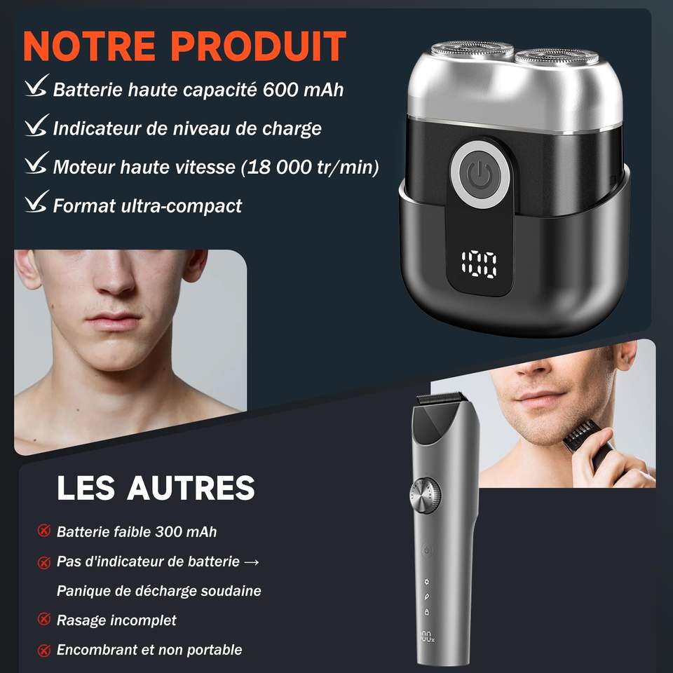 Mini rasoir électrique gris pour hommes avec écran LED, étanche, silencieux, portable, IPX7, pour le visage, lames remplaçables, lavable