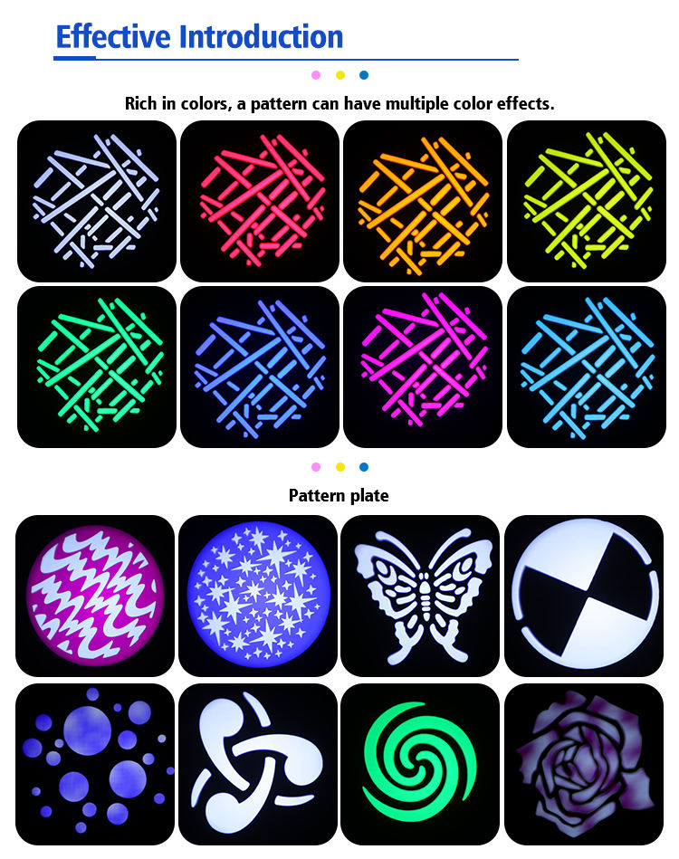 Roue Gobo:Plaque de gobo fixe (8 gobos + blanc), gobo rotatif (6 gobos + lumière blanche)
