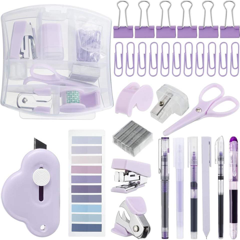 Mini kit de fournitures de bureau : Agrafeuse, dévidoir de ruban adhésif, déagrafateur, trombones, ciseaux, agrafes, stylo, taille-crayon, essentiels pour la prise de notes