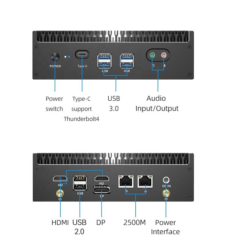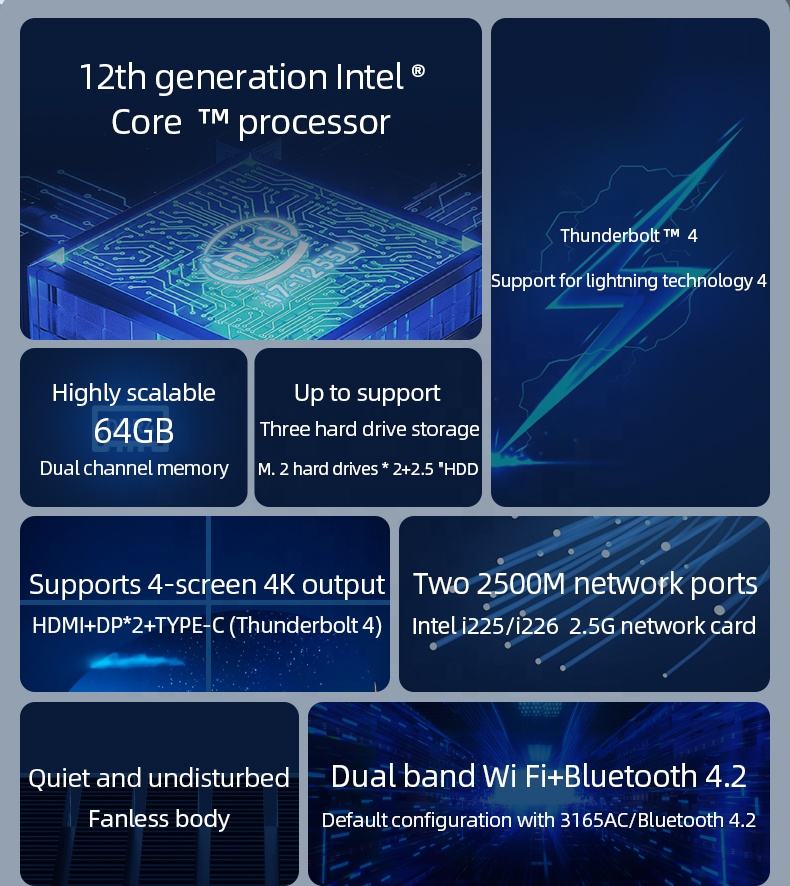 Mini PC 12e génération Core I3i5i7 Baremetal HD DP Thunderbolt4 Mémoire 64G DDR4 Noir Sans ventilateur I3 I5 I7 Ordinateur de bureau LINUX