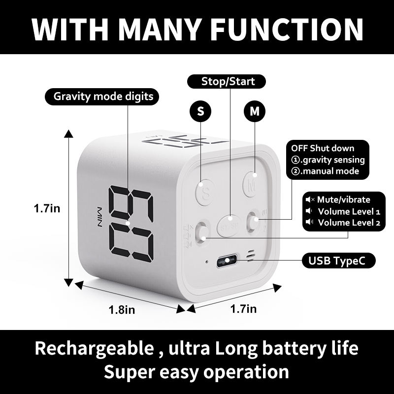 Mini minuteur à LED à capteur de gravité en plastique avec 4 temps prédéfinis pour la cuisine, l'étude, l'exercice et la méditation