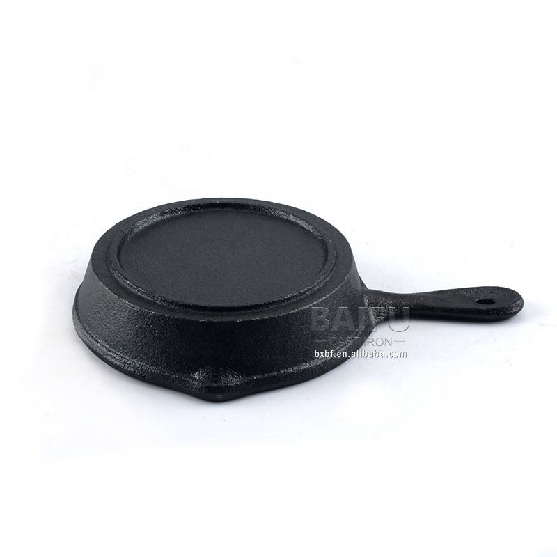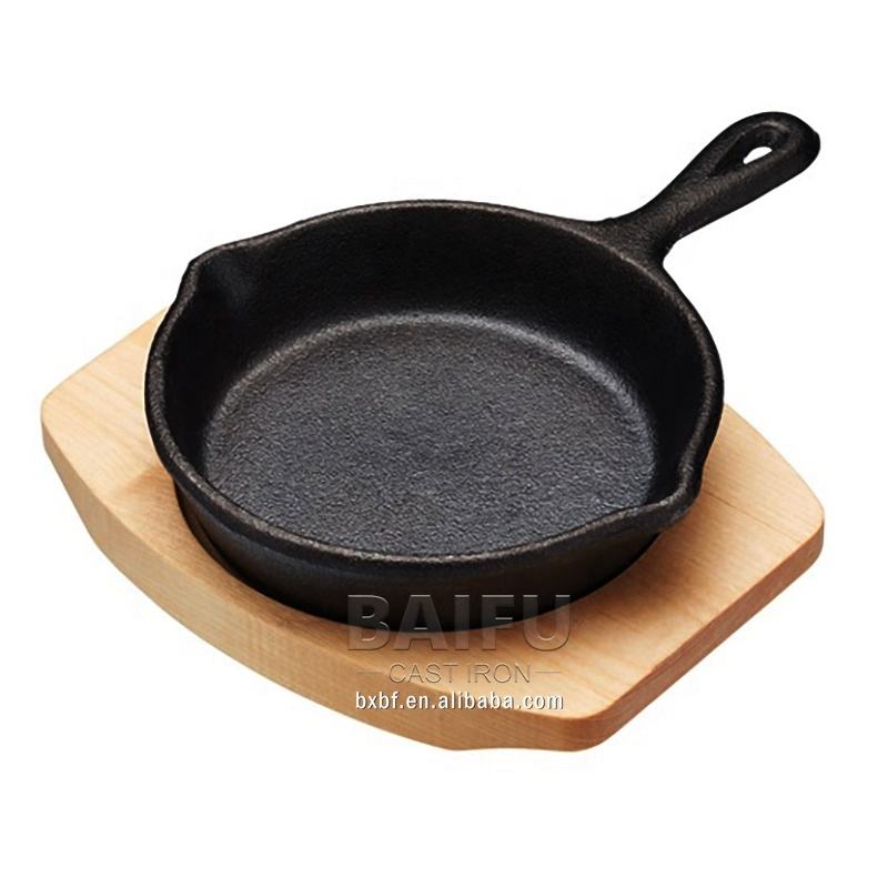 Mini plat de cuisson en fonte pré-assaisonné, plat de service, poêle à frire avec base en bois, poêle à griller en fonte
