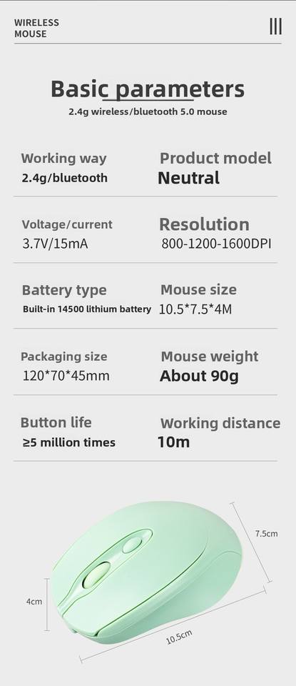 Mini souris optique sans fil USB 2.4G+BT, réglable 800-1600DPI, 4 boutons, rechargeable, design ergonomique pour ordinateur de bureau/portable