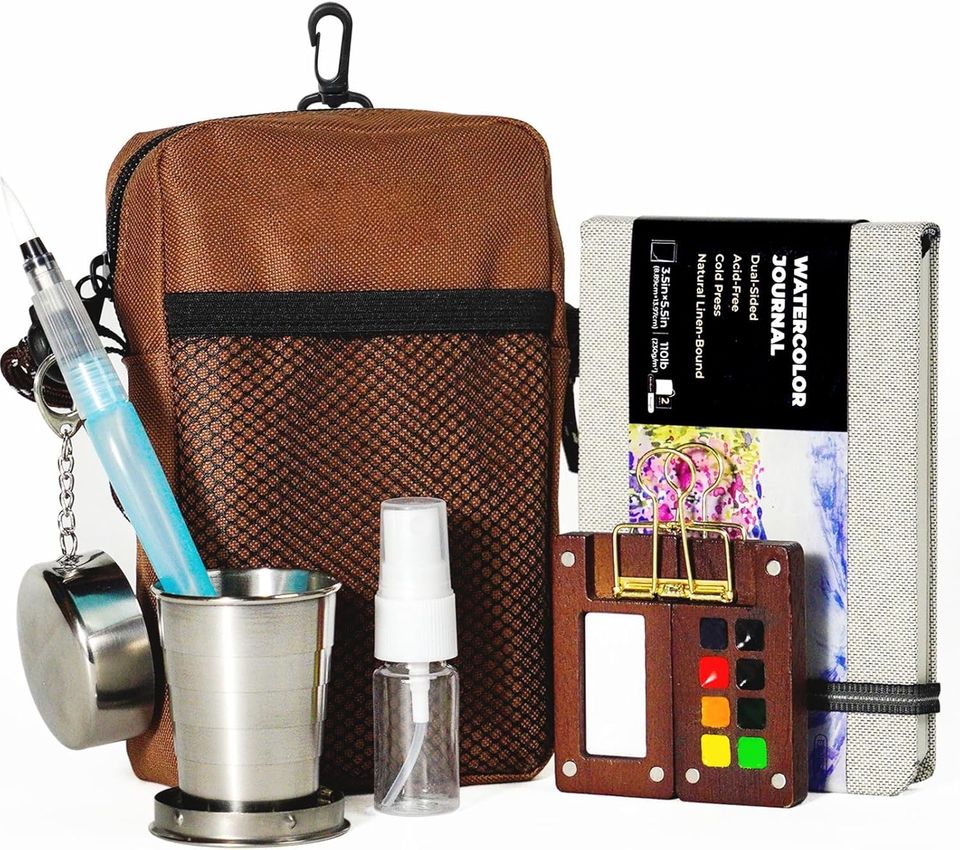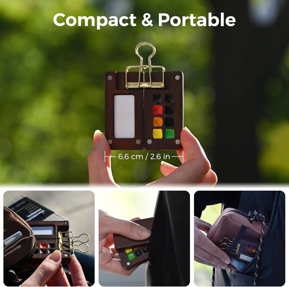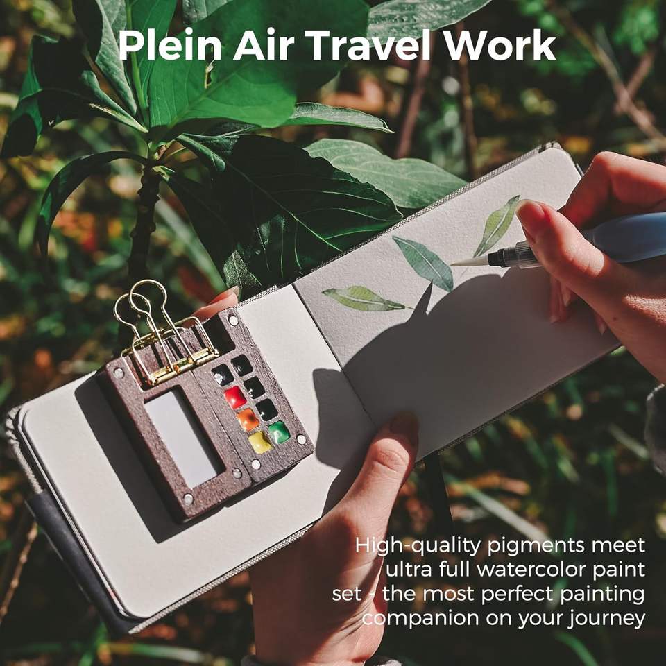 Mini ensemble de peinture aquarelle avec boîte en bois de noyer 8 couleurs pinceaux tasse à eau Kit de poche de voyage avec sac pour artistes