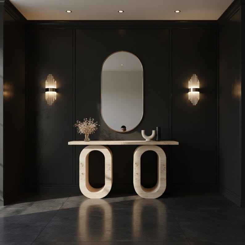 Table console en travertin de luxe sculpturale minimaliste, design moderne en forme de U, meuble d'entrée, taille personnalisée, pierre naturelle