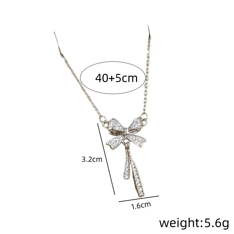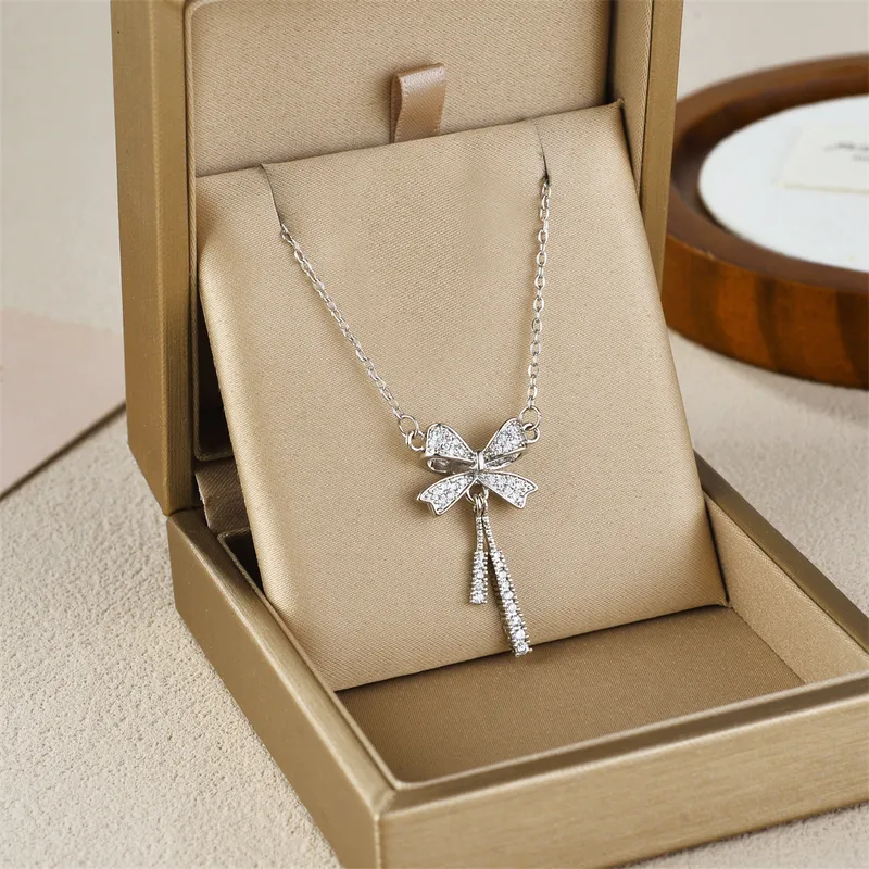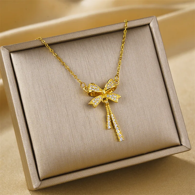 Minimalist 18K Gold Plated Steel Necklace Featuring Copper Inlaid Zircon Tassel Bow Pendant Women Elegant Collarbone Chain
