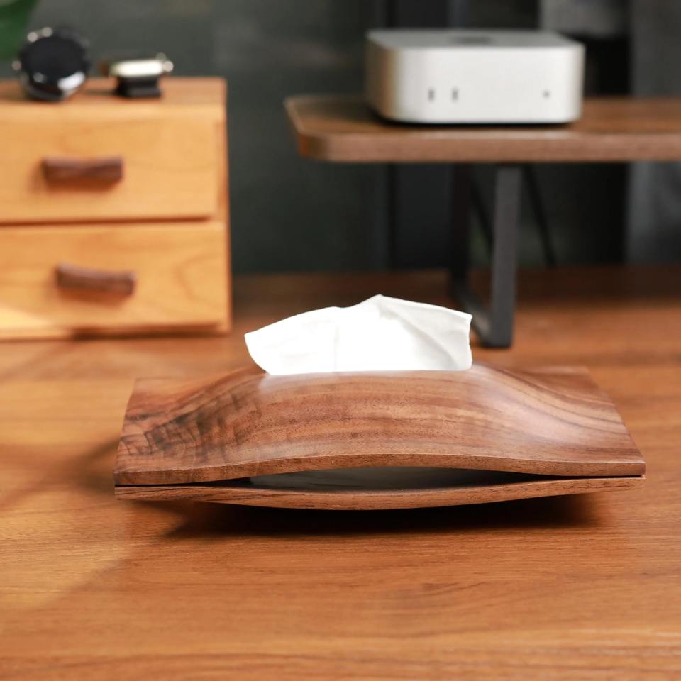 Boîte à mouchoirs minimaliste en noyer noir, forme ondulée, accessoire décoratif parfait pour un bureau formel ou une salle de séjour, provenant d'Inde