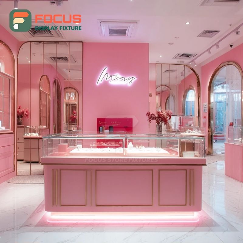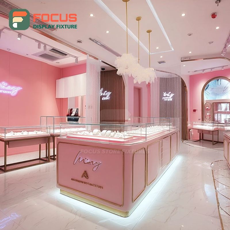 Fabricant de systèmes de présentation de bijoux minimalistes sur mesure, finition laminée, armoire à bijoux pour magasin de marque
