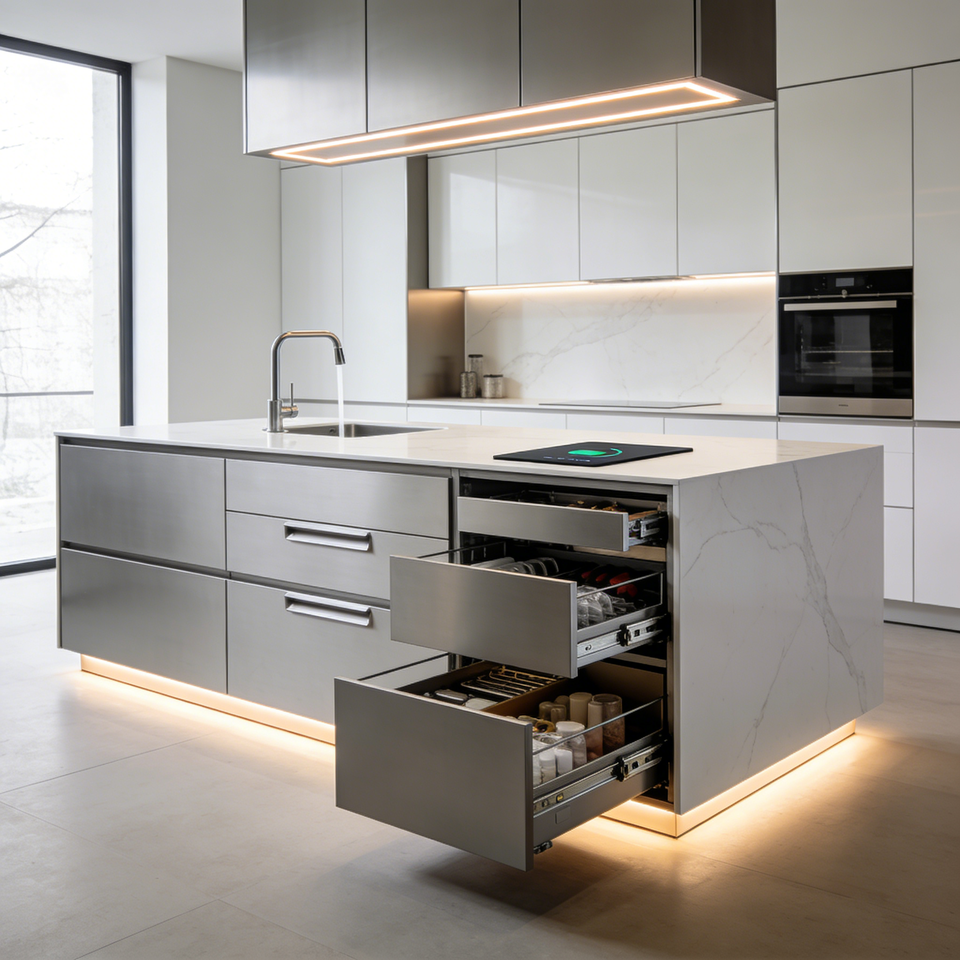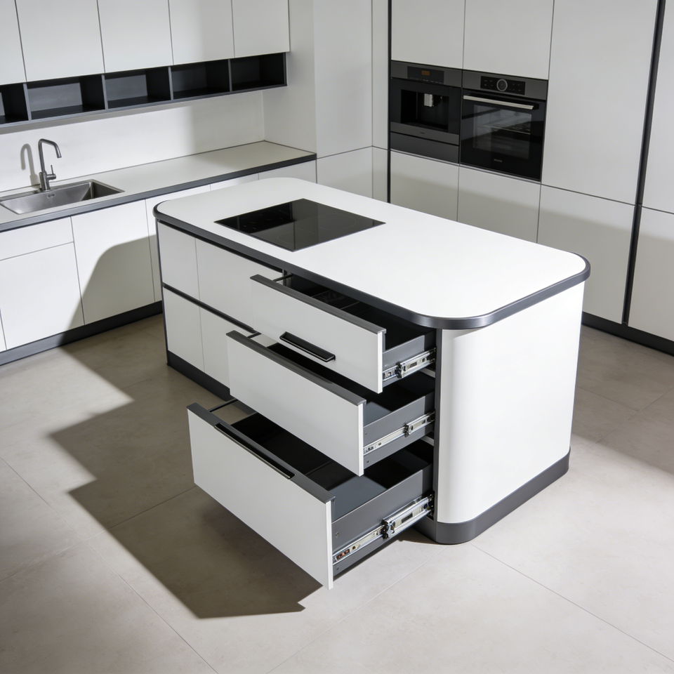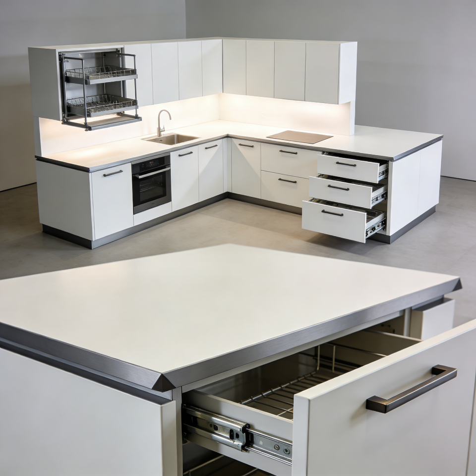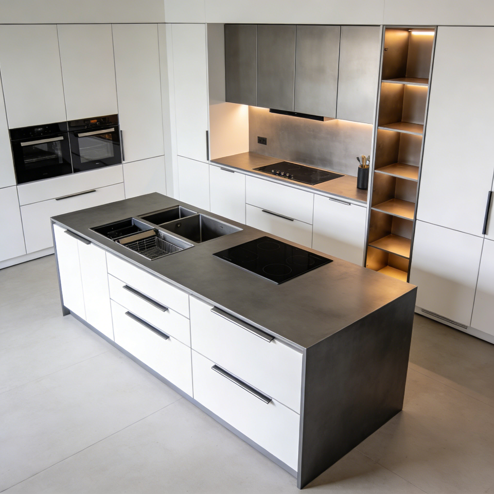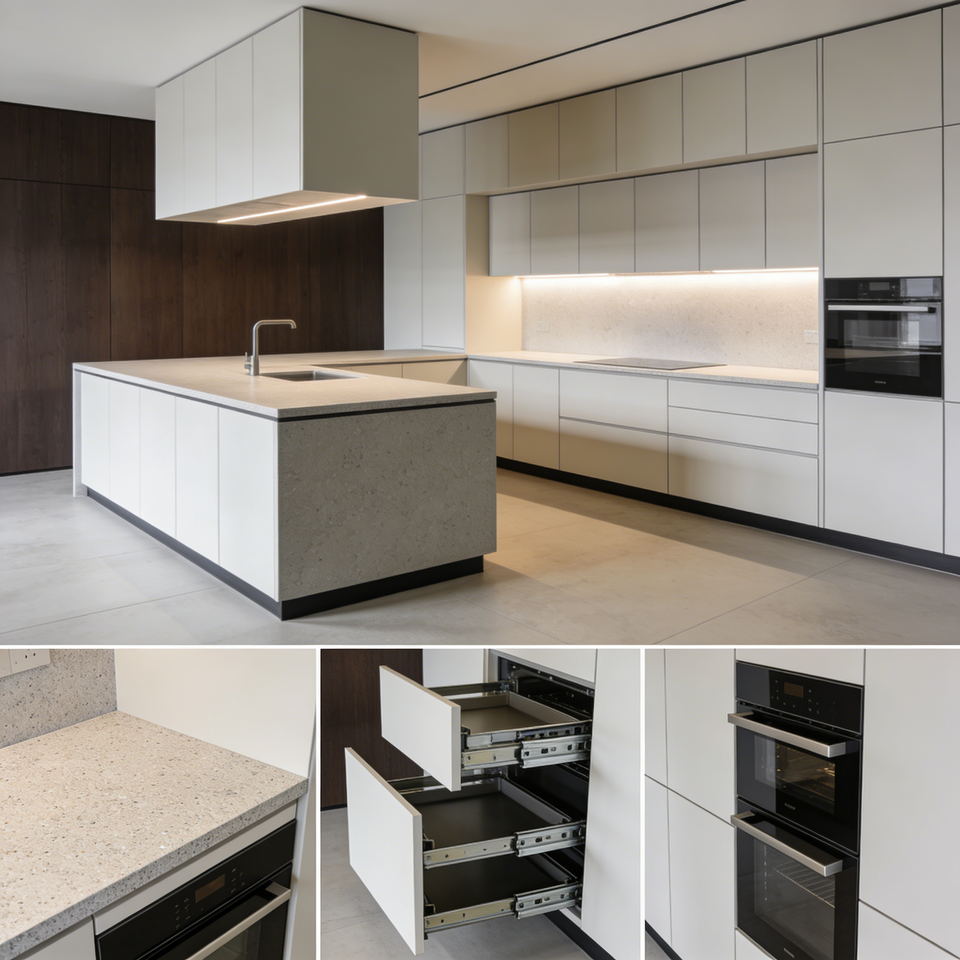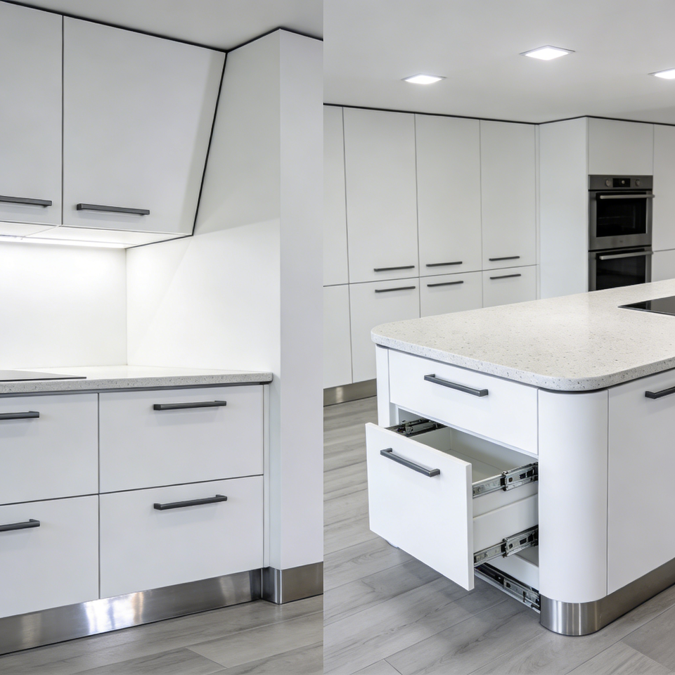 Meubles de cuisine minimalistes sans poignées avec finition ultra brillante, évier et plaque de cuisson intégrés