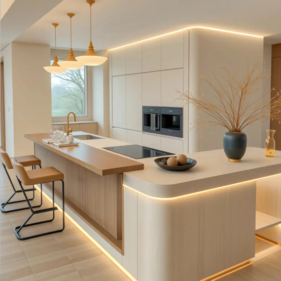 Meubles de cuisine minimalistes avec four encastré, portes sans poignées et plan de travail en quartz