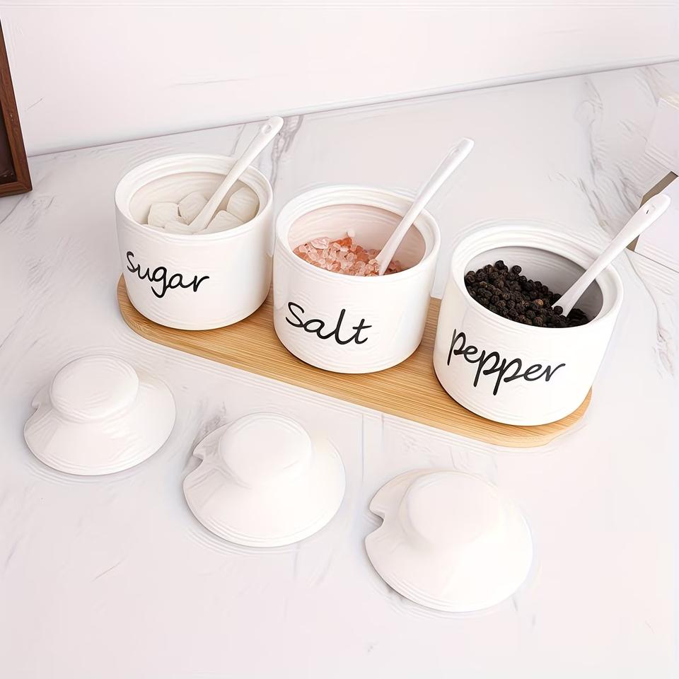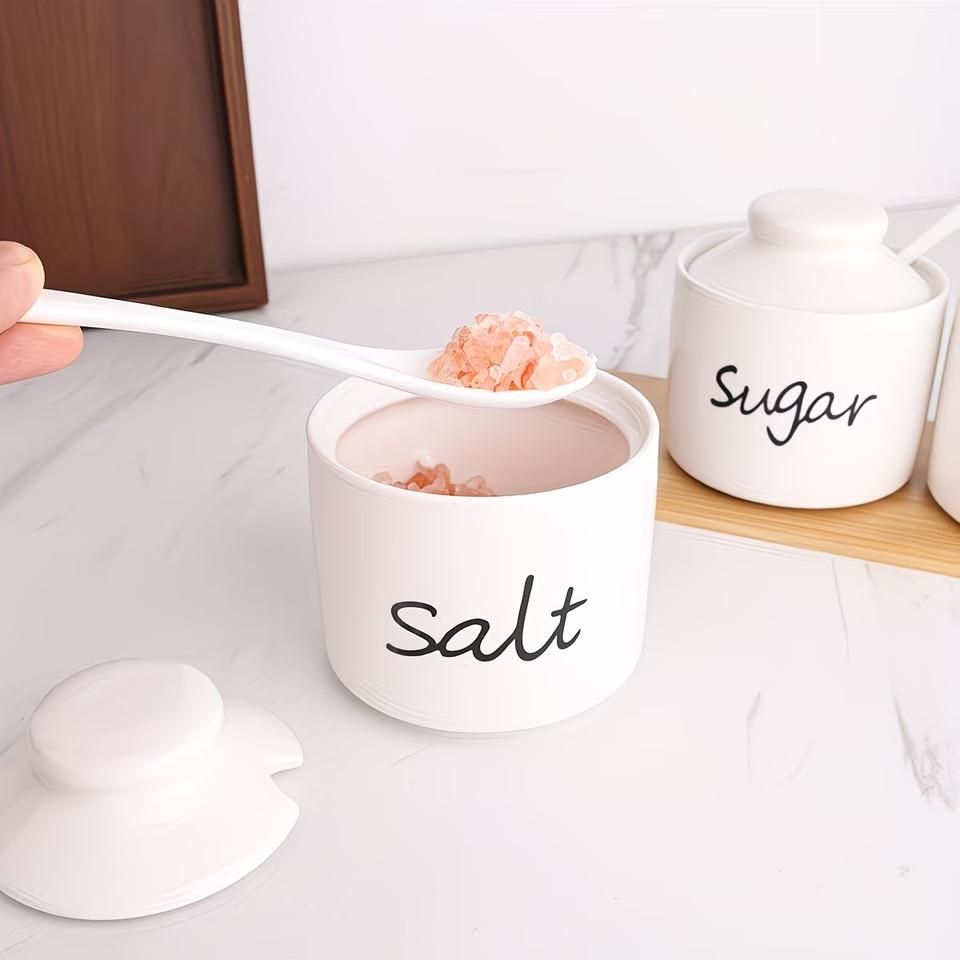 Ensemble de pots de rangement minimalistes pour cuisine avec couvercle, cuillère et plateau en bois – Organisateur élégant pour comptoir, idéal pour sucre, sel et poivre