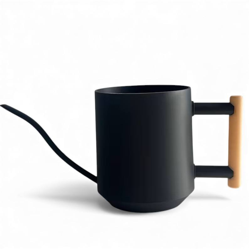 Arrosoir Minimaliste Noir Mat avec Poignée Latérale en Bois et Bec Verseur de Précision pour Plantes d'Intérieur