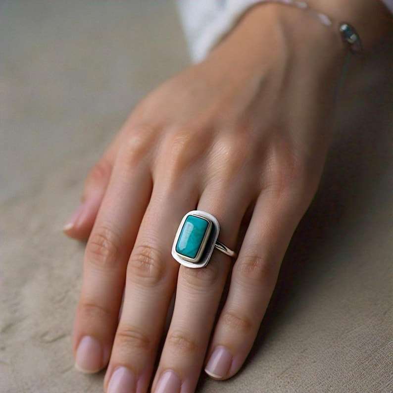 Bague rectangulaire minimaliste en turquoise, argent 925, pierre précieuse naturelle, faite à la main, simple, pierre de naissance de décembre, certifiée IGI, haute qualité