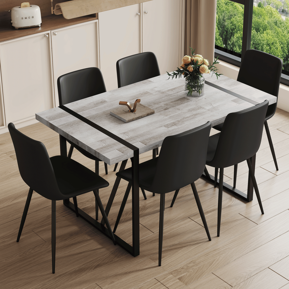 Ensemble de salle à manger rétro minimaliste Table rectangulaire avec pieds en métal noir et 6 chaises Conception de coussin incurvé en matériau PU artificiel