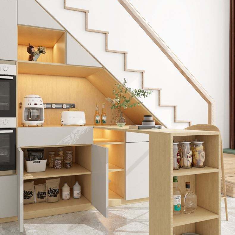 Buffet minimaliste en bois massif avec armoire à vin, finition lisse, tiroirs à fermeture douce, compartiments de rangement ouverts, espace de repas bien organisé
