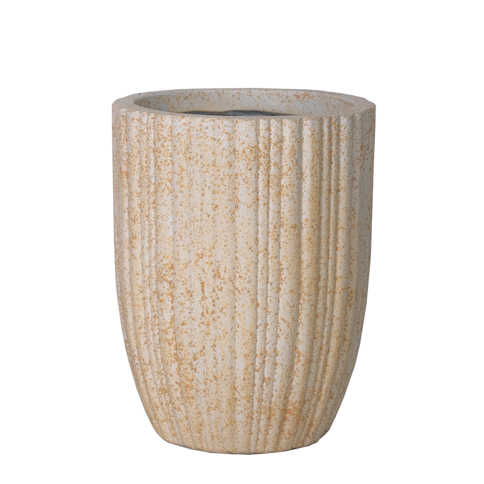 Pot minimaliste beige moucheté avec surface nervurée et finition mate
