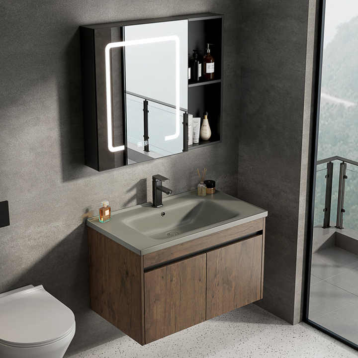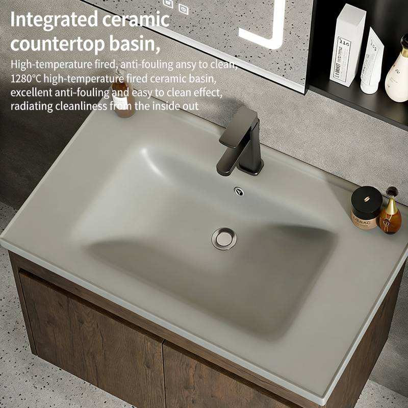 Meuble de salle de bain mural minimaliste avec vasque intégrée en céramique et panier de rangement spacieux