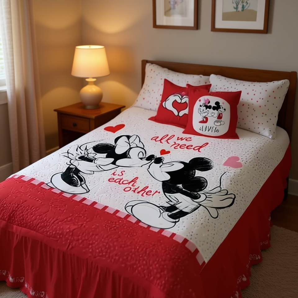 Ensemble de couette double Minnie Love, coton 100% polyester, appliqué brodé, literie de dessin animé, usage domestique, toutes saisons