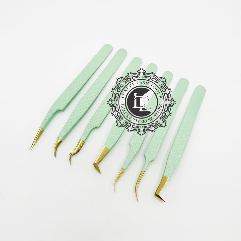 Pince à épiler d'extension de cils à poignée de diamant vert menthe avec pointe dorée Pointe durable et pointue Logo privé Offre de prix de gros