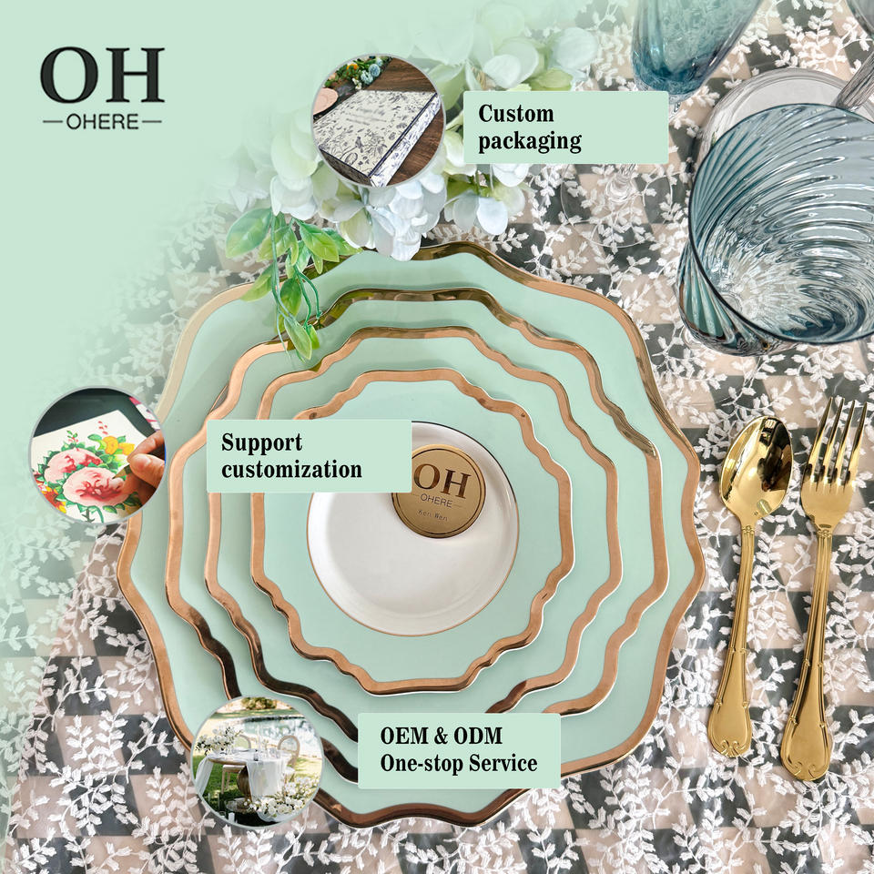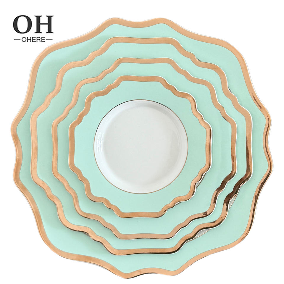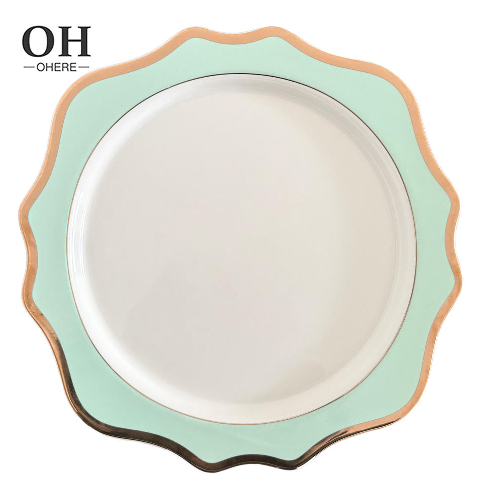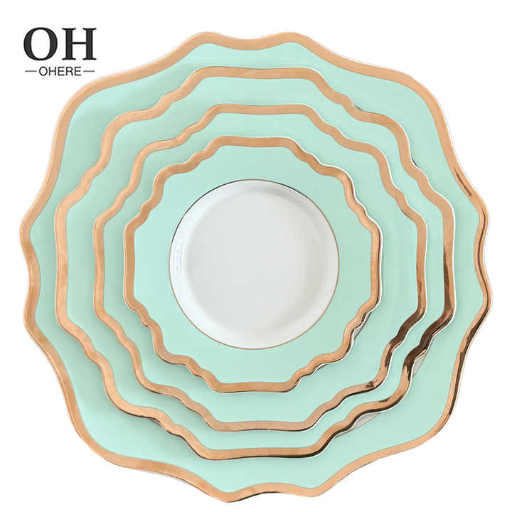 Service de table en porcelaine vert menthe motif tournesol, décor pour événements de mariage, assiette de présentation à bord doré, vaisselle et assiettes en céramique vertes