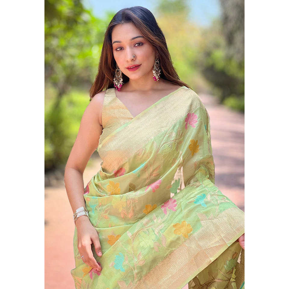 Elite Weaves Mint Green Women's Set Organza Meenakari Floral Jaal Zari Woven Saree