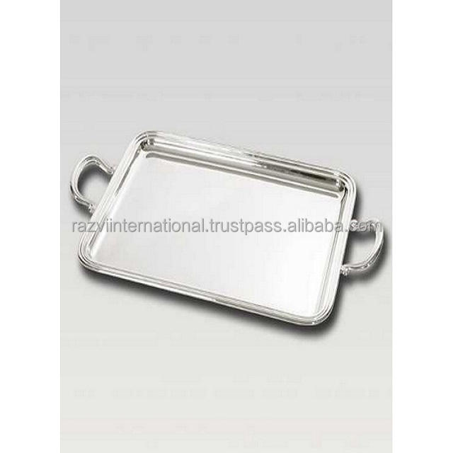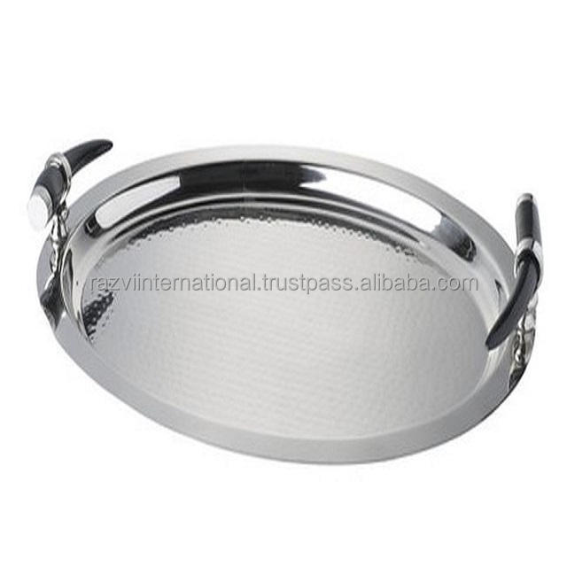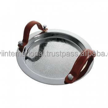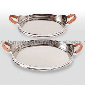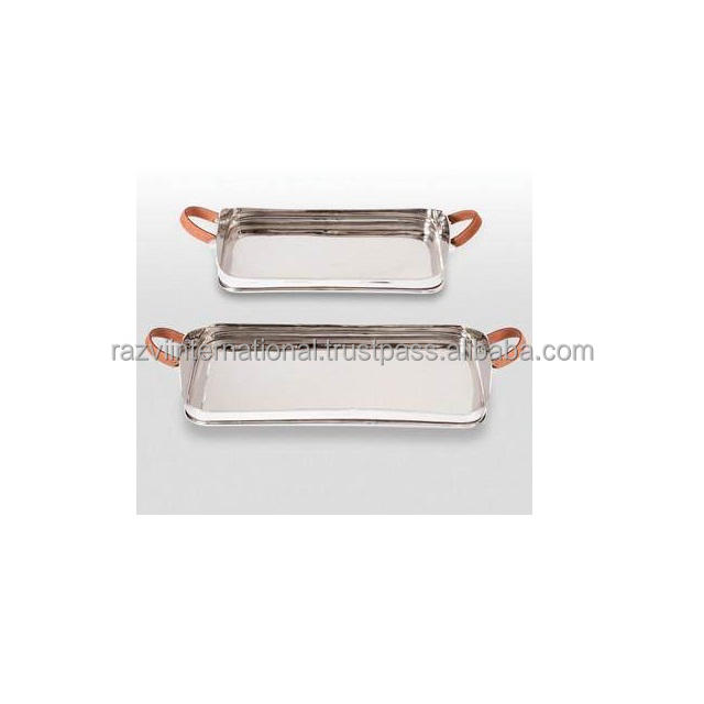 Plateau de service en acier inoxydable, finition miroir avec poignée en cuir