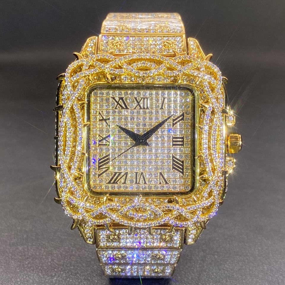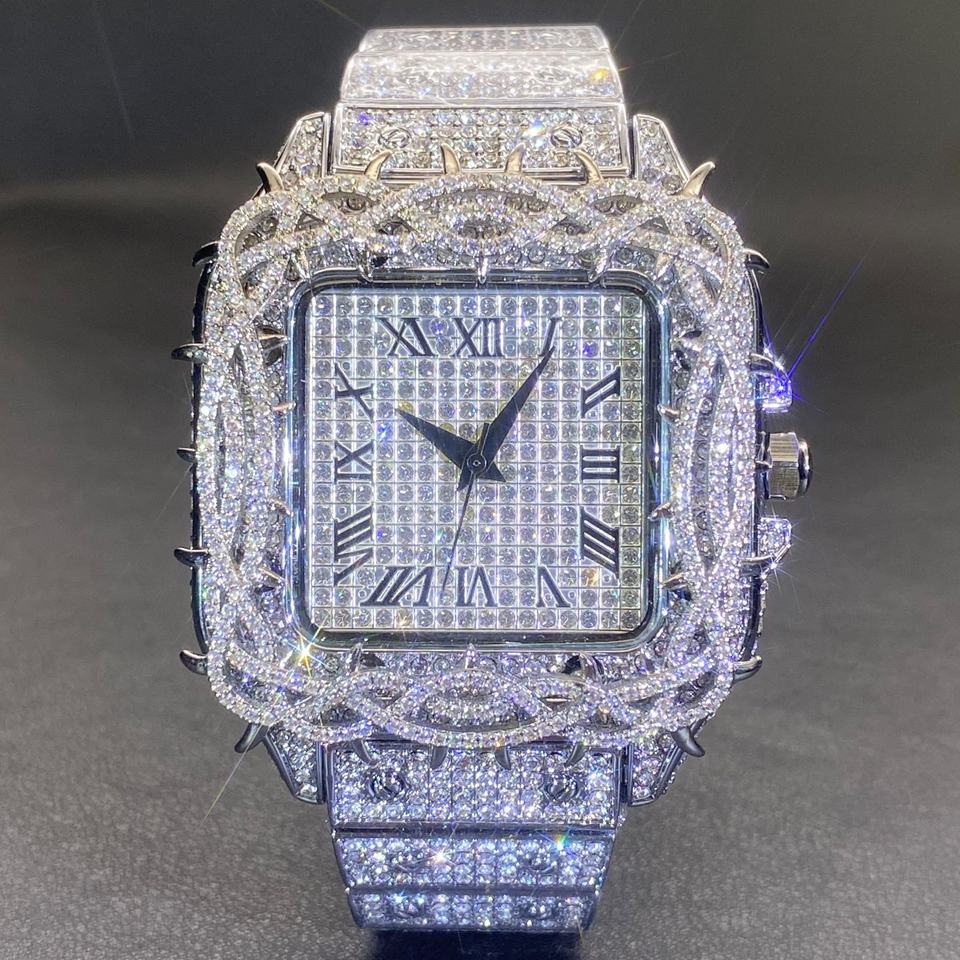 Montre à quartz pour homme Missfox, style hip-hop européen et américain, cadran Ice Thorn incrusté de zircon, carré, entièrement serti de diamants, métal, acrylique, étanche