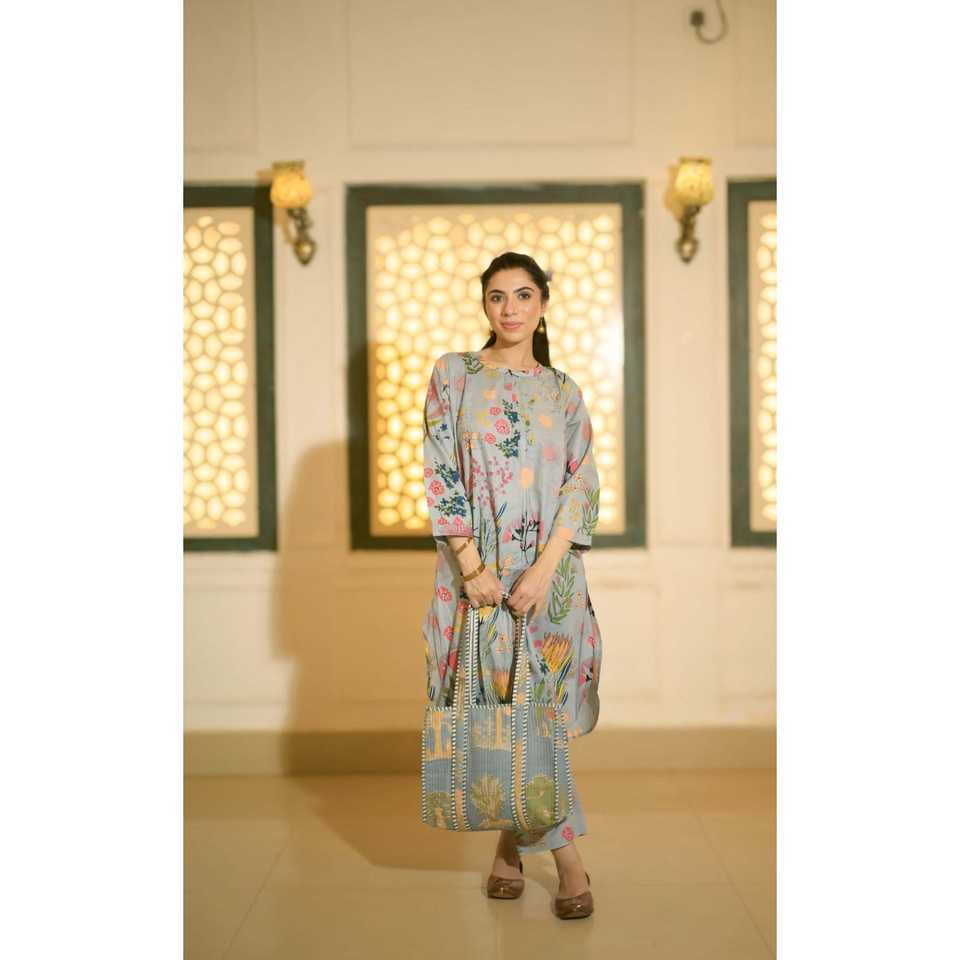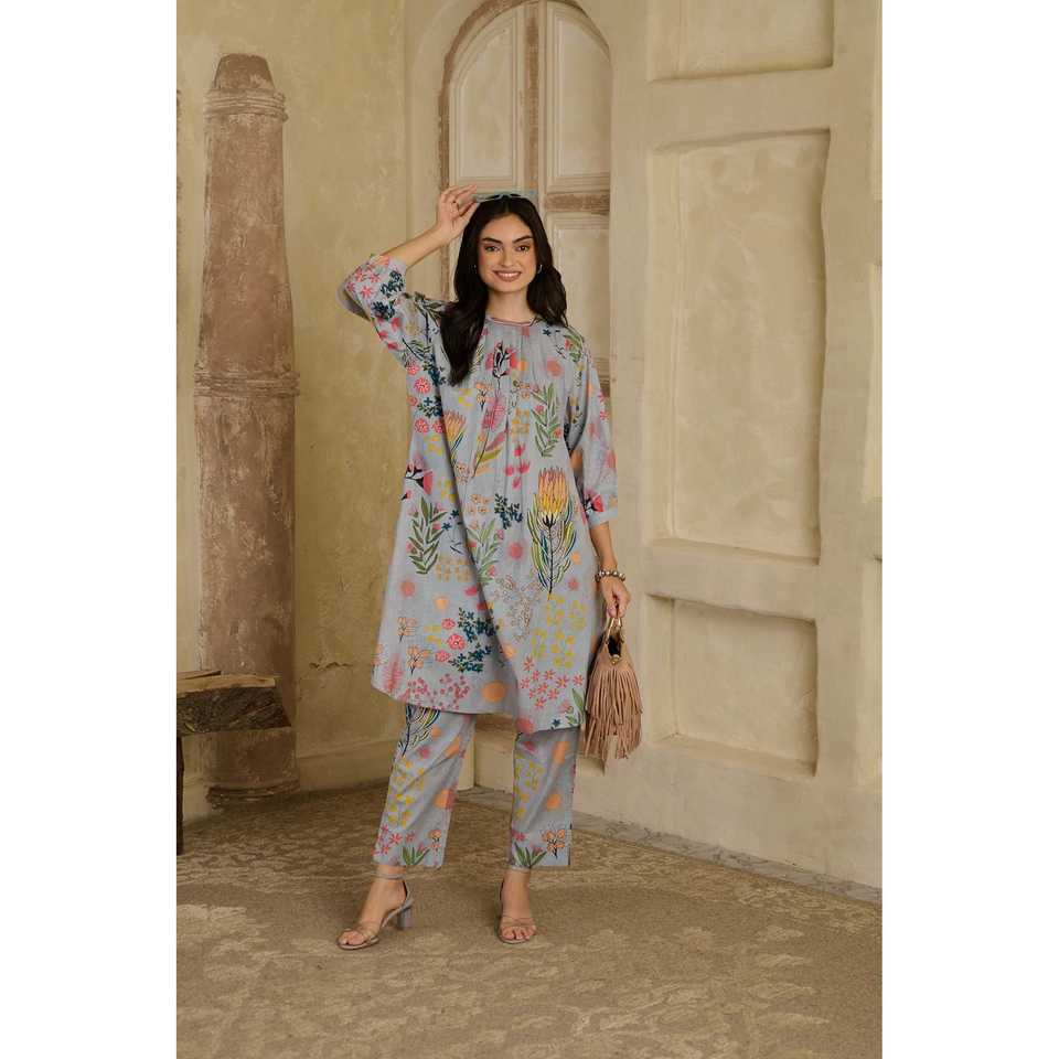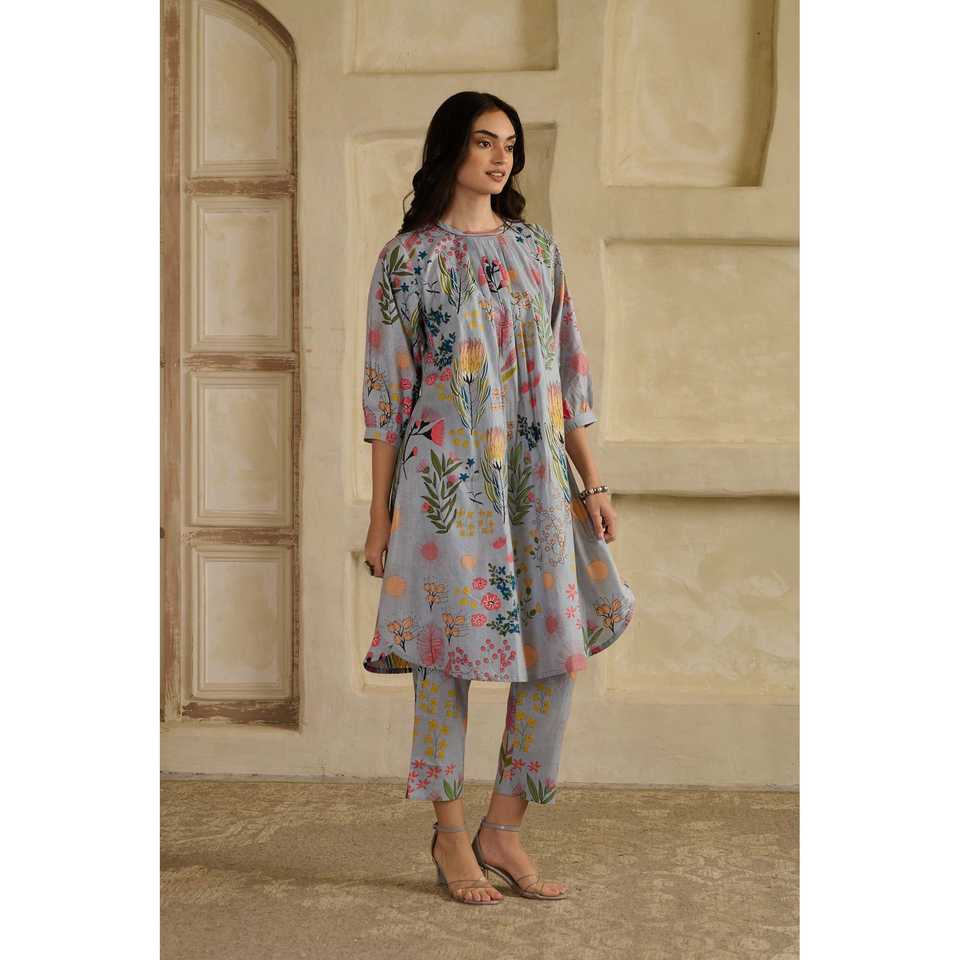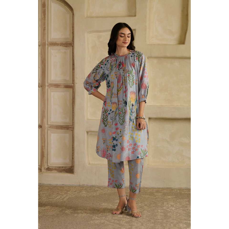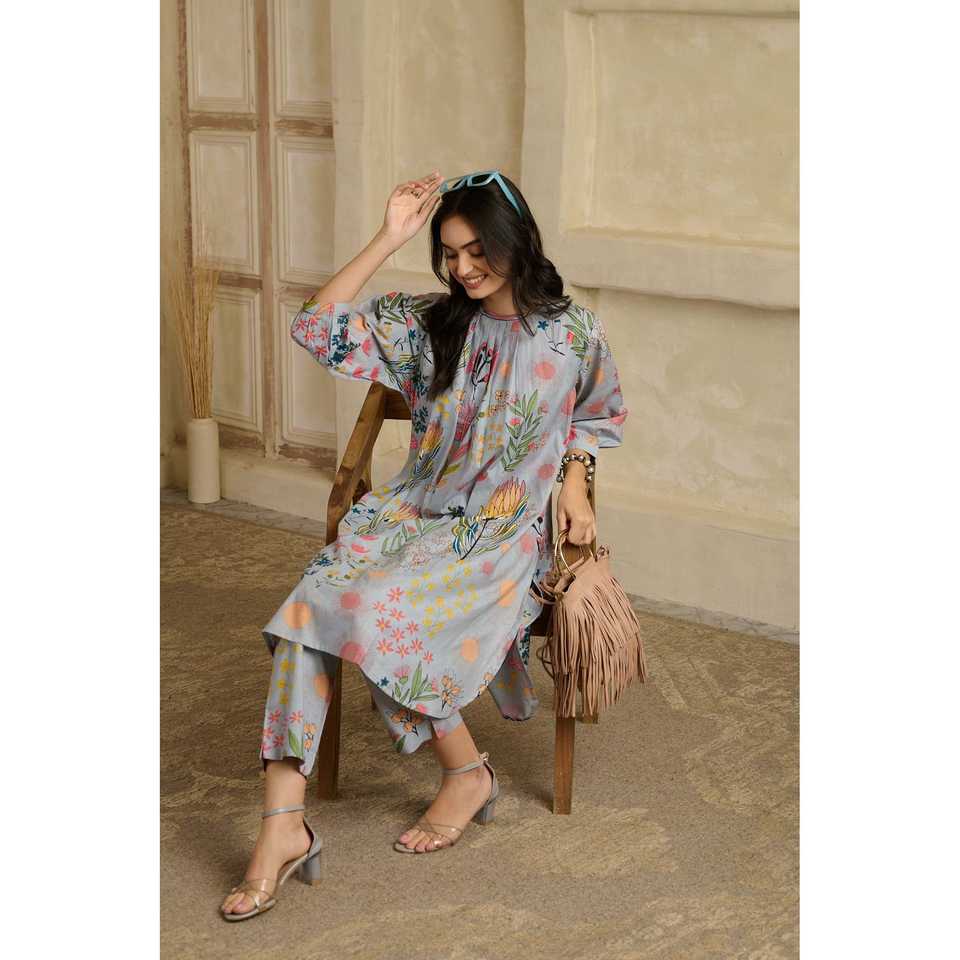 Ensemble Kurta Bohème Misty Grey Meadows à Col en V Sans Manches Respirant de 37 Pouces en Crêpe pour la Saison Printemps/Été
