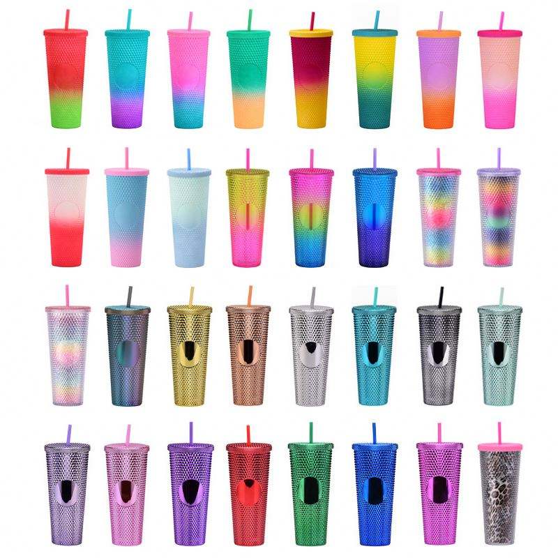 Gobelet en plastique à paillettes diamantées, couleurs mélangées, sans BPA, 24 oz, multicolores, avec logo personnalisé, dégradé, avec couvercle et paille
