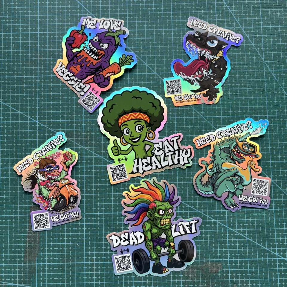 Autocollants en vinyle imperméables résistants aux intempéries, designs variés, impression holographique personnalisée, découpe sur mesure, étiquette autocollante avec code QR