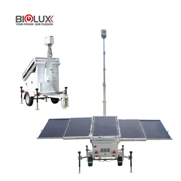 Tour de surveillance mobile avec caméra CCTV, panneau solaire monocristallin, contrôleur MPPT Starlink IA, mât de 7 m, batterie haute capacité