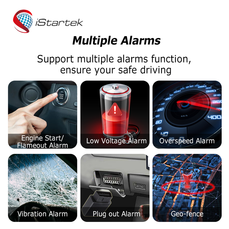 LTE 4G CAT1 et 3G et GSM, GPS+LBS+Positionnement, Protocole OBD II, Diagnostic GPS, Alarme anti-sabotage, Alarme de collision, Surveillance du comportement de conduite, Protection contre les faibles puissances, Enregistrement GPSFonction