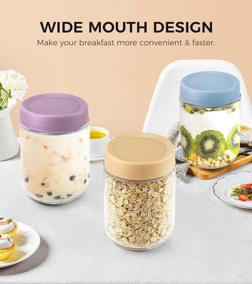 Ensemble de pots en verre modernes de 16oz, vente en gros de 4 pièces, bocaux Mason hermétiques pour la préparation de repas d'avoine de nuit, graines de chia