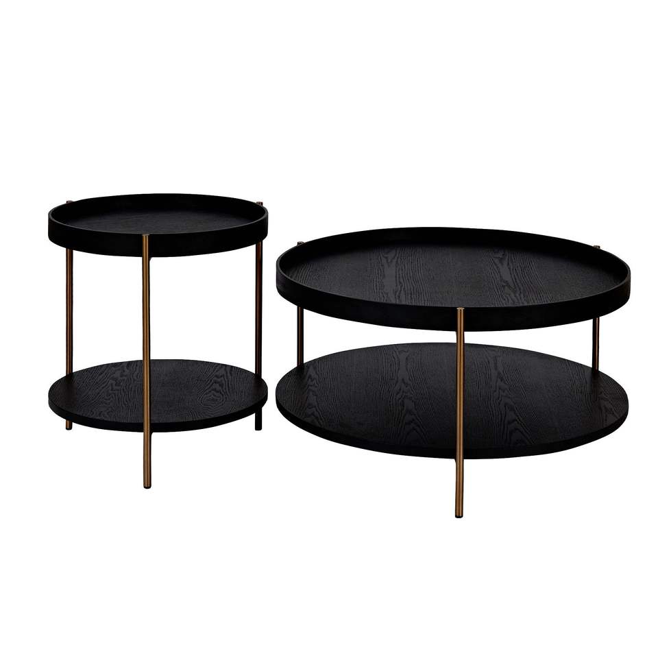 Ensemble de tables basses rondes modernes en 2 pièces avec structure en métal et plateau en bois pour le mobilier de salon