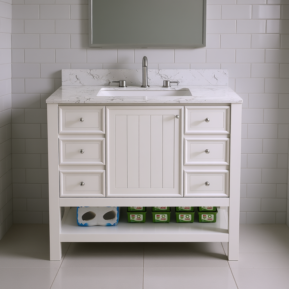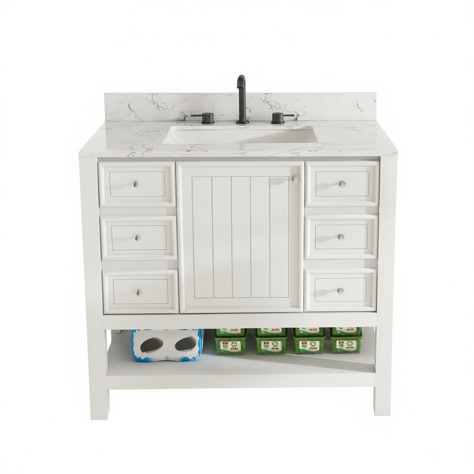 Ensemble de meuble-lavabo moderne blanc de 37 pouces avec dessus en marbre, tiroirs et support au sol