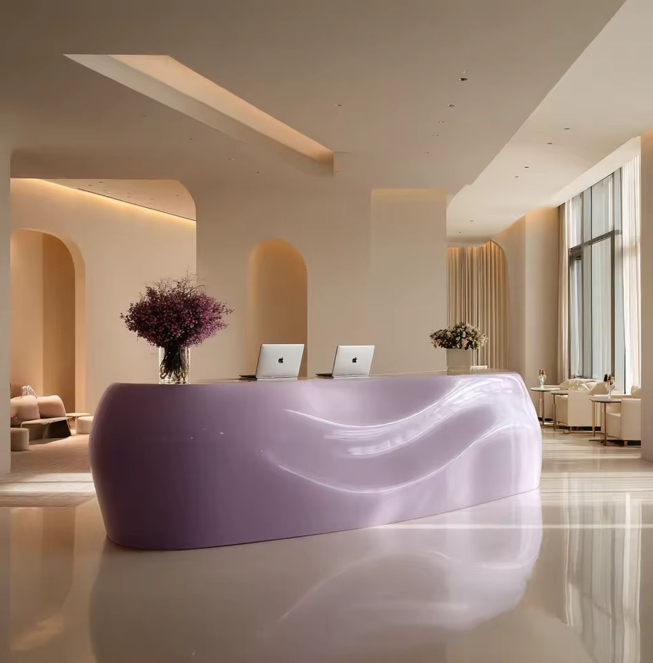 Comptoir de réception moderne imprimé en 3D, texture naturelle beige, comptoir de hall pour spa, complexe hôtelier et usage commercial