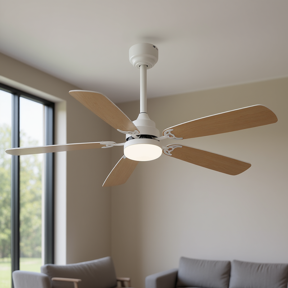 Ventilateur de plafond 52 pouces, pales en bois, moteur DC, lumière LED, télécommande, 6 vitesses, réversible, pour intérieur domestique