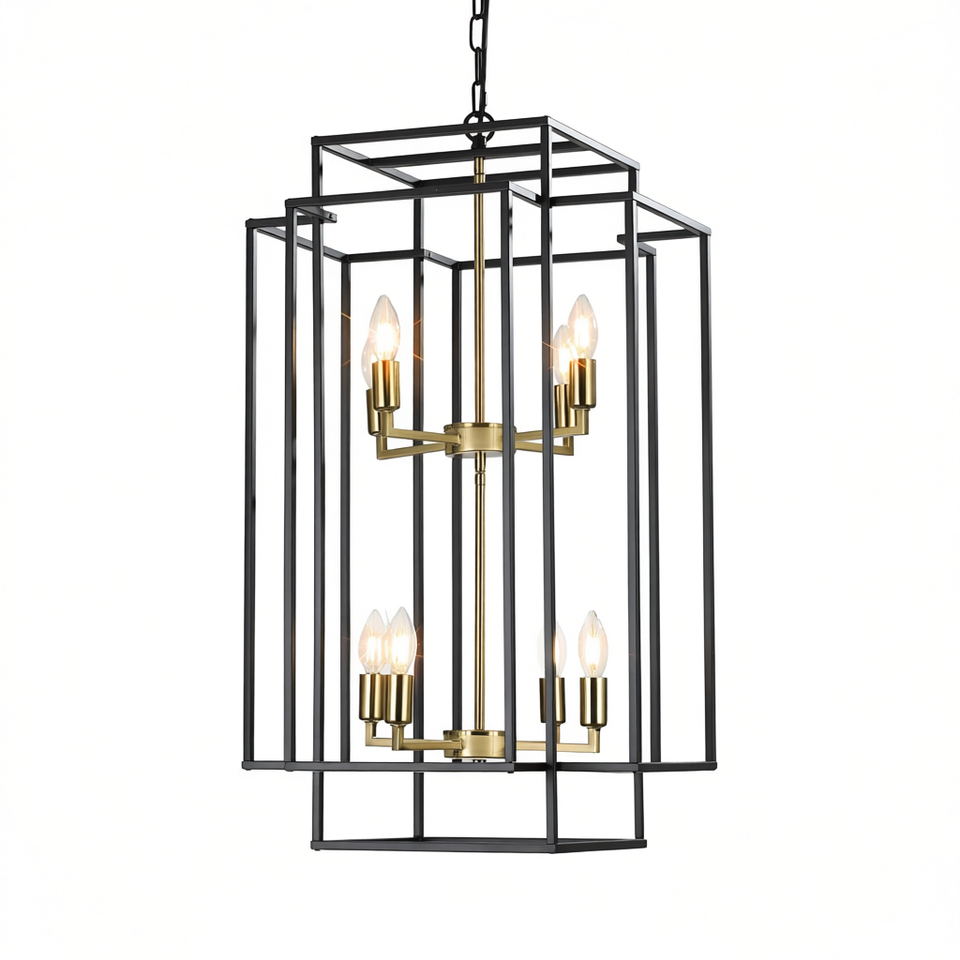 Lustre suspendu géométrique moderne 8 lumières noir et or, cadre métallique industriel, éclairage réglable pour salon