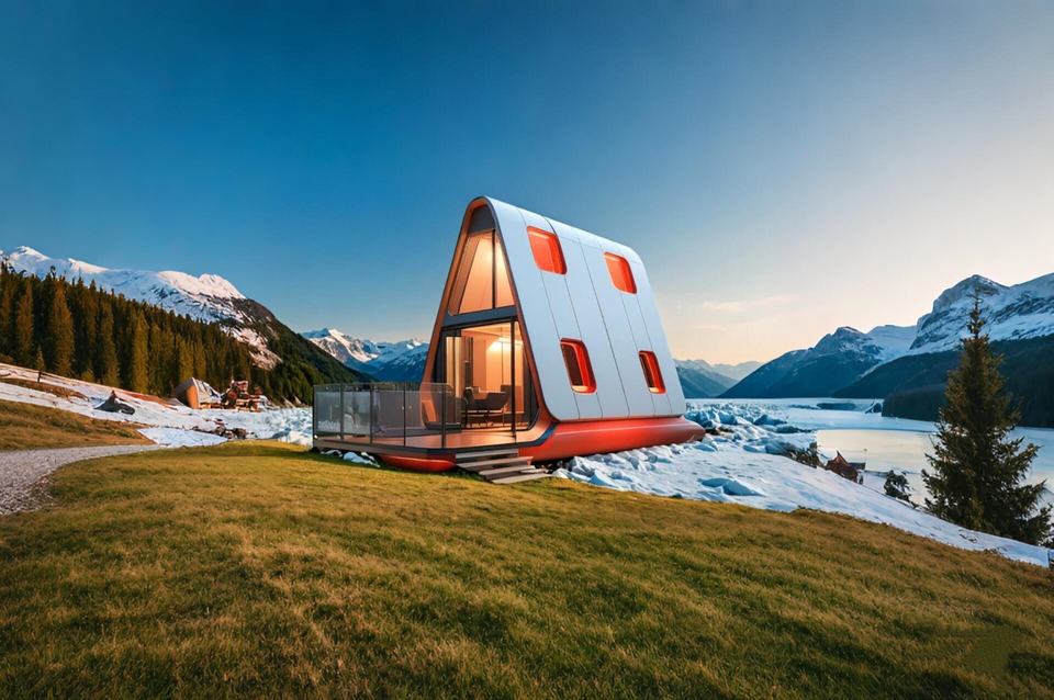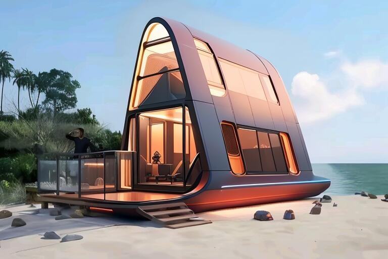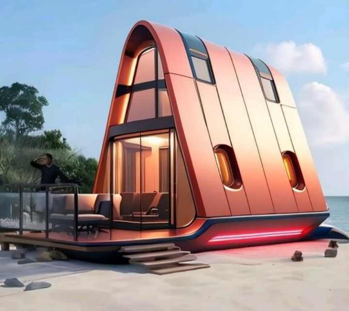 Maison capsule moderne en forme de A avec vue sur l'océan pour séjour en bord de mer
