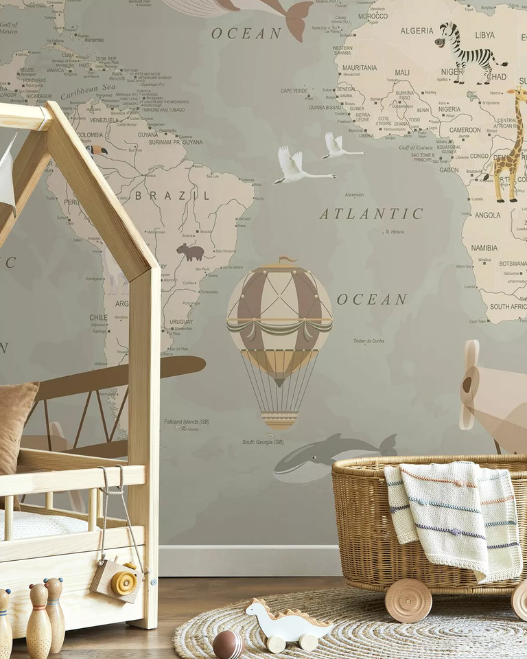 Papier peint carte du monde sur le thème de l'aventure moderne pour enfants Installation pelable et collante étanche avec navires et avions pour peinture murale