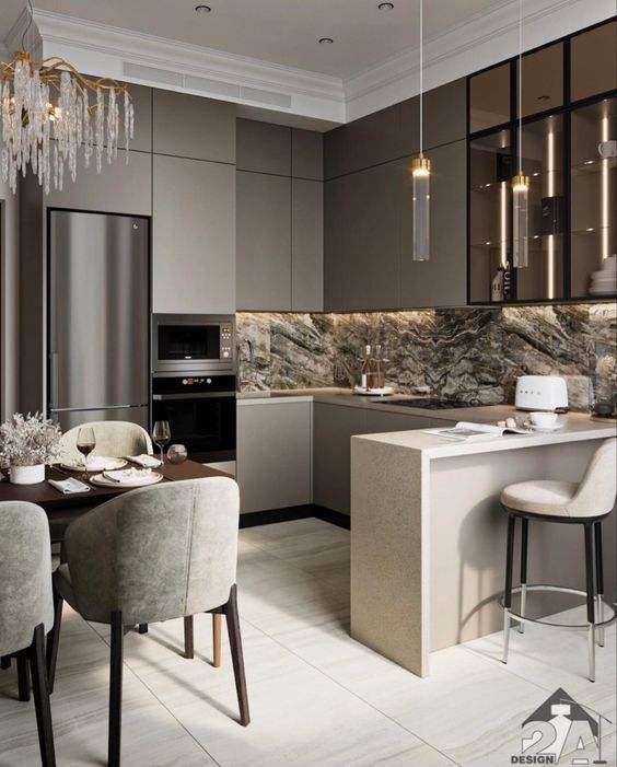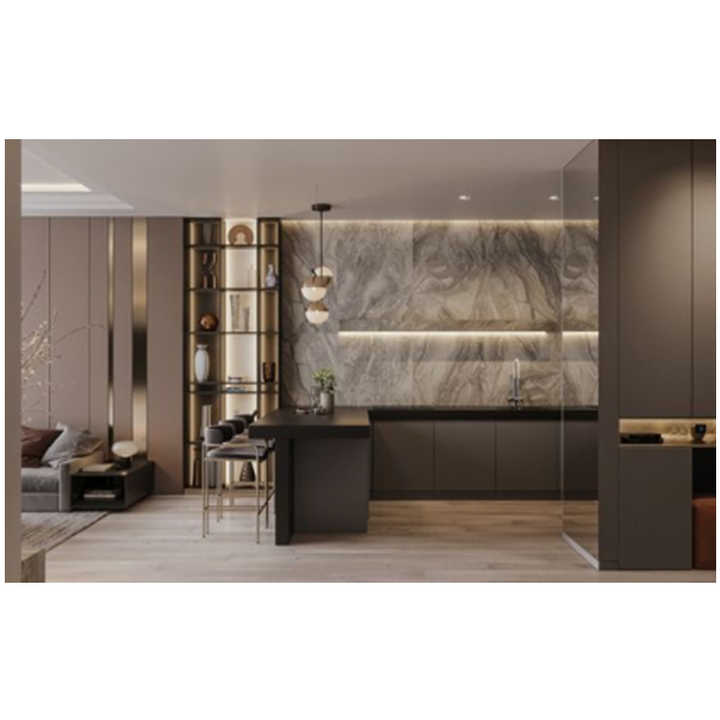 Appartement moderne qualité garde-manger cuisine salon bois marbre banc TV haut lumières accessoires meubles armoires ensemble design