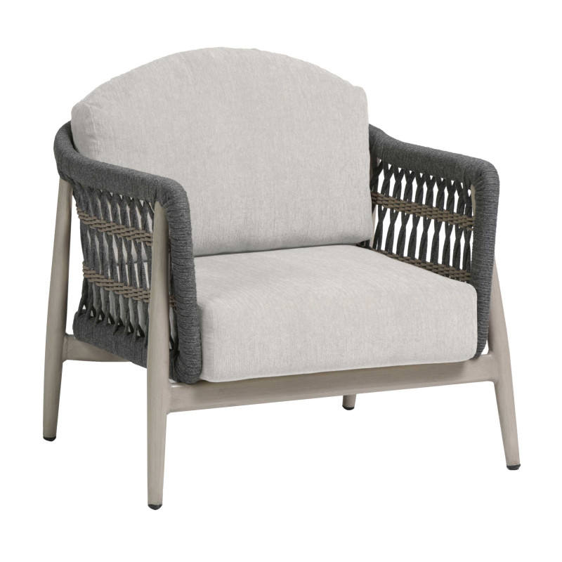 Fauteuil moderne avec pieds en teck massif, structure en aluminium, dossier en corde tressée et assise rembourrée pour usage intérieur/extérieur, villas et cours.