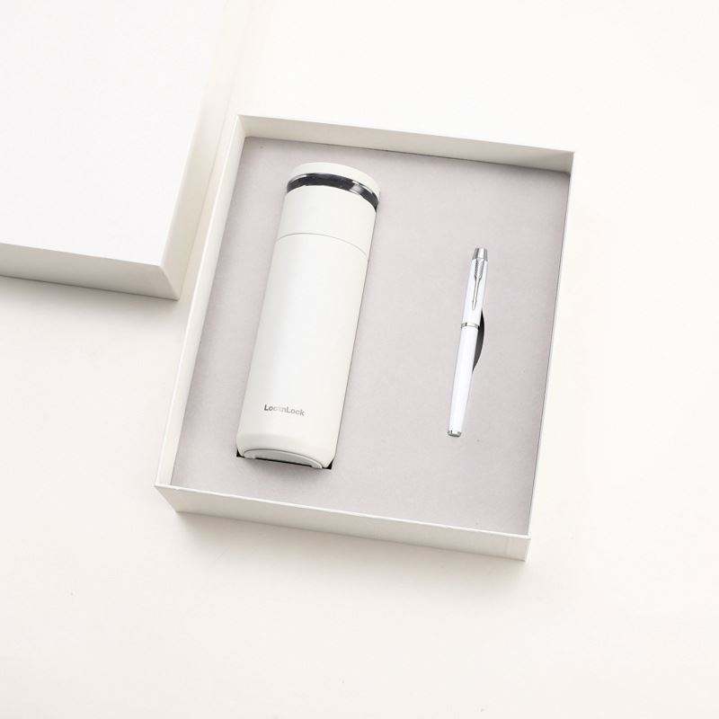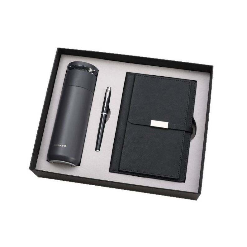 Coffret Cadeau d'Affaires Moderne : Tasse Isotherme Gravée en Acier Inoxydable avec Séparation Thé & Eau, Parapluie et Carnet