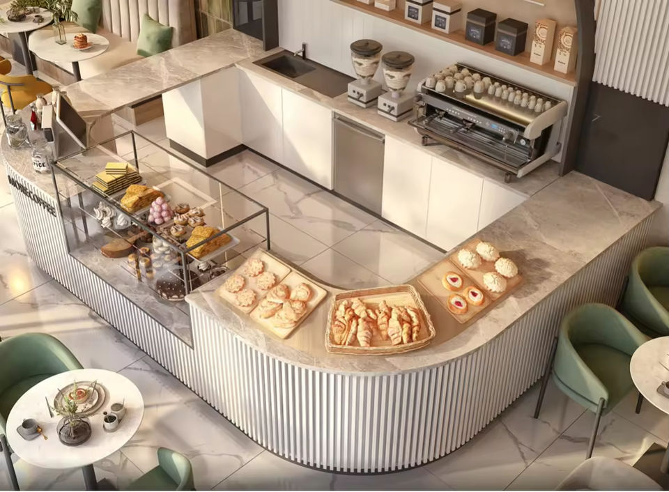 Conception d'intérieur moderne pour boulangerie et café, aménagement commercial sur mesure, décoration industrielle pour boulangerie et café